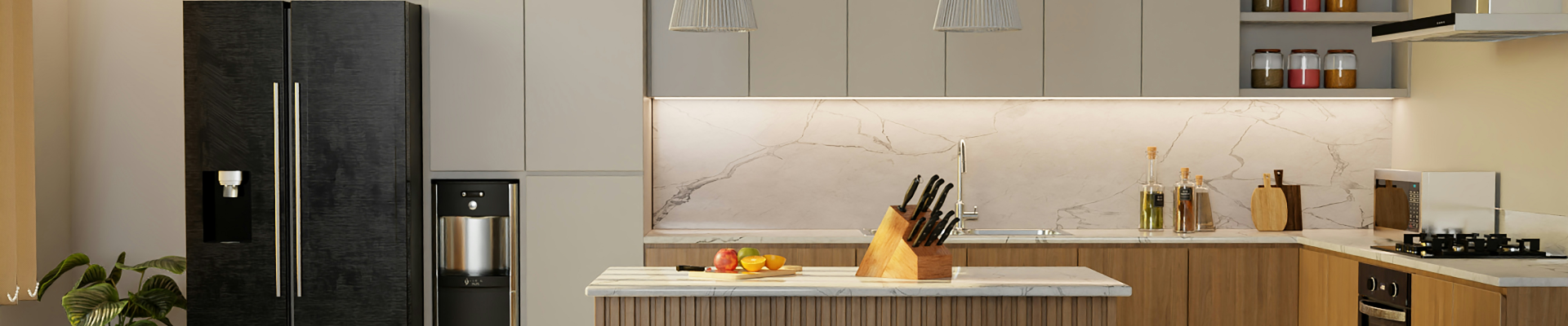 Living, Dining & Bar Interior Defined by Engineered Stone and Integrated Delivery